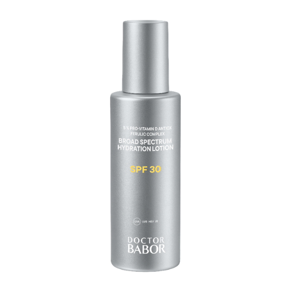 Dr Babor Broad Spectrum Hydration Lotion SPF 30 är ett snabbabsorberande solskydd för ansikte och kropp med SPF 30. Solskyddet skyddar mot UVA, UVB, HEV och Blått ljus. Berikad med antioxidanter som ferulsyra, ectoin och provitamin D stärks hudens barriär och huden skyddas mot oxidativ stress. Dr Babor Broad Spectrum Hydration Lotion SPF 30 innehåller även ett komplex som skyddar mot värmeinducerat hudåldrande. Passar alla hudtyper och tillför intensiv återfuktning utan att kännas fet på huden.