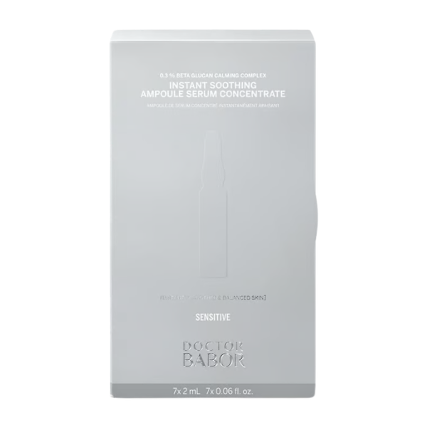 Dr. Babor Instant Soothing Ampoules är ett 7-pack ampullkit som ger omedelbar lindring till irriterad och stressad hud. Ampullerna innehåller stjärningrediensen beta-glukan som jobbar lugnande, rodnadsdämpande och återfuktnade. Tillsammans med mikrosilver och multimolekylära hyaluronsyror lindras snabbt rodnad, irritation och stramhet i huden. Instant Soothing Ampoules ger en omedelbart lugnare effekt till känslig hud, och stärker barriären på sikt. Resultatet är en balanserad, lugn och välmående hud.