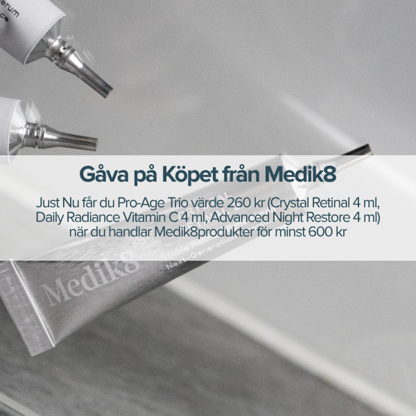 Medik8 är ett prisbelönt, globalt varumärke för hudvårdsprodukter som endast säljs av läkare och hudterapeuter. Medik8 produkter är framtagna, utvecklade och sammansatta av ett team med biokemister och farmakologer i vår forskningsanläggning i Storbritannien. Medik8 tillverkar endast produkter med bevisad teknologi och professionell styrka. Medik8 produkter är särskilt framtagna för att fokusera på ålderstecken, akne, rodnad, pigmentering och torr hud.