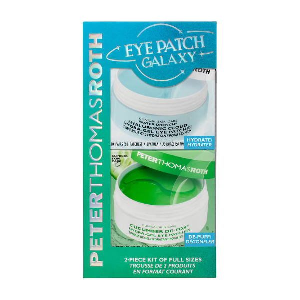 Peter Thomas Roth Gift Set Eye Patch Galaxy 60 pair är ett lyxigt set som innehåller både produkterna Water Drench®Eye patches och Cucumber De-Tox® Hydra-Gel Eye Patches i full storlek (30 par i varje förpackning). Water Drench® Hyaluronic Cloud Hydra-Gel Eye Patches är berikade med hyaluronsyra och arnica, vilket ger intensiv återfuktning och hjälper till att reducera synligheten av fina linjer, skrattlinjer och mörka ringar. Cucumber De-Tox® Hydra-Gel Eye Patches innehåller en lugnande blandning av gurka och aloe vera, som återfuktar och minskar svullnad under ögonen. Efter användning får ögonområdet en fräschare, mer ungdomlig och återfuktad känsla.